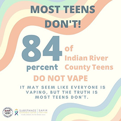 | The School District has implemented a comprehensive tobacco free policy and have greatly increased education about the dangers of vaping to youth. The first media campaign of the year focused on how ‘Most Teens Don’t.’ This campaign, in Partnership with the Substance Abuse Free Indian River Coalition, focused on changing the norm surrounding ‘everyone does it.’ The poster highlights how 84% of Indian River County Teens do not vape, to increase awareness among youth that vaping is not the norm. | ![]() |