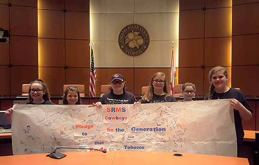 Sebastian River Middle School’s SWAT Club is pledging to be the generation that ends tobacco! In February they received a proclamation from Indian River County Commissioners for Through with Chew Week. Because smokeless has long been identified with baseball players, students asked commissioners to ban ALL tobacco, smoking, vaping and chewing, from parks and playing fields. Students spoke about needing to breathe air without second hand smoke, litter caused by cigarette butts, cancer from chewing tobacco, and the powerful drug nicotine that is extremely addictive.
