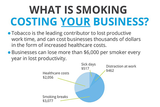 Tobacco use and recreational nicotine use via e-cigarettes at work can cost employers money. The loss of productivity for a business with smokers is estimated to cost $4,056 in productivity and $2,056 in medical costs per year (2).